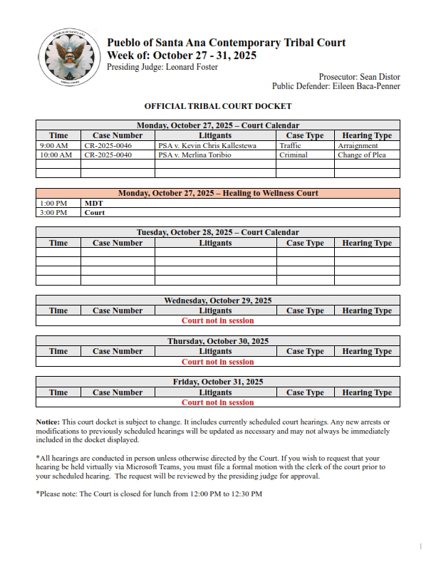 Contact the Pueblo of Santa Ana Contemporary Court Deputy Clerk, Janiece Garcia, at (505) 584-1732 or email janiece.garcia@santaana-nsn.gov for available dates. When you call, please provide the following information: