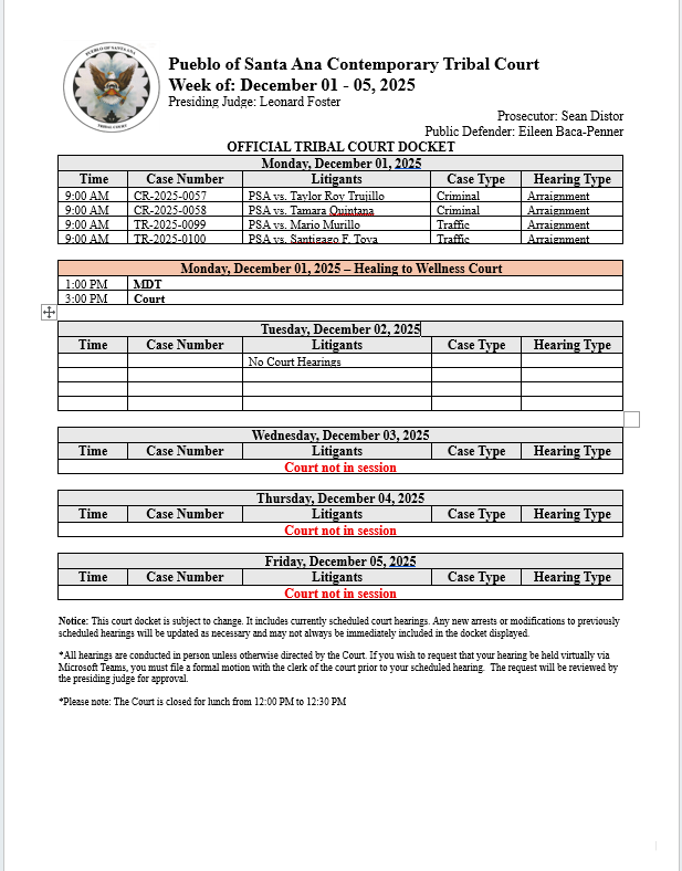 ATTENTION: As of July 1, 2023, the Pueblo of Santa Ana is now compliant with the Tribal Law and Order Act and Violence Against Women Act. Santa Ana Tribal Court is now enforcing enhanced sentencing in all criminal cases. Please refer to Santa Ana Tribal Code Title 8 Article 43 for all details and information.