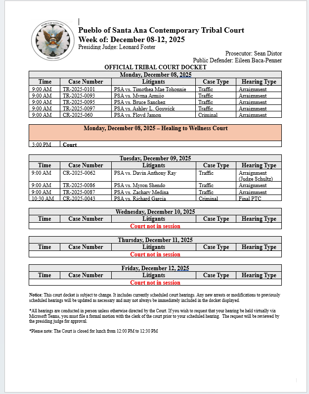 Santa Ana Tribal Court Weekly Docket